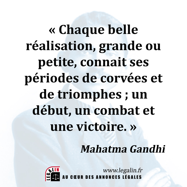 Citation inspirante du Mahatma Gandhi destinée aux créateurs d'entreprises... comme aux autres ! "Chaque belle réalisation, grande ou petite, connait ses périodes de corvées et de triomphes ; un début, un combat et une victoire".